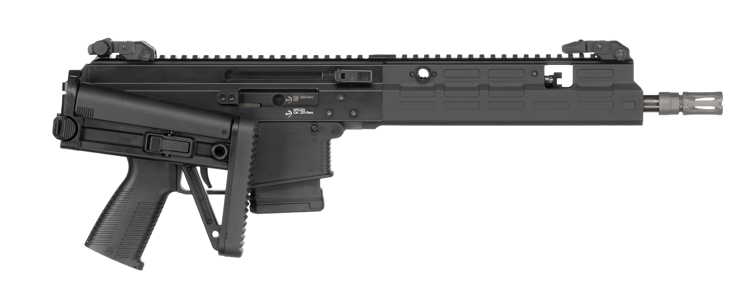 Die APC223/556 war der zweite Teil des APC-Systems. Sie vereint die am meisten nachgefragten Merkmale der APC9 in einem Paket, das entweder die .223 Remington oder die 5.56mm NATO Patrone abfeuert. Das verwendete Design bietet eine ausgezeichnete Zuverlässigkeit. Da das Gas zur Vorderseite der Waffe hin ausgestoßen wird und nicht wie bei einem Gasdrucksystem ins Innere des Gehäuses gelangt, wird die Waffe auch weniger verschmutzt.